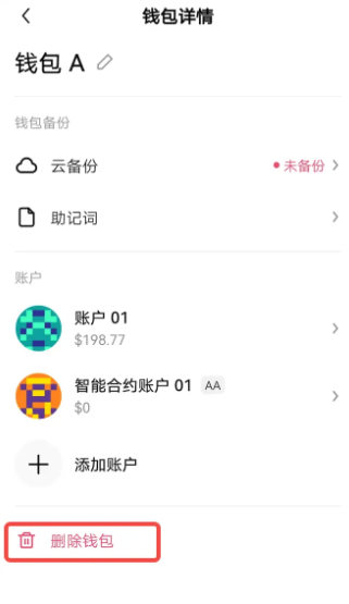 在钱包首页点击钱包 ▼ > 钱包管理 > 编辑钱包···,对于 1 个无私钥钱包或 1 个私钥钱包创建的 AA 智能合约账户,可以点击页面底部的 删除钱包 > 输入钱包密码 > 确认删除。