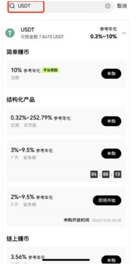 6、或者搜索您想参与的币种,选择相应的赚币产品,按要求进行申购。