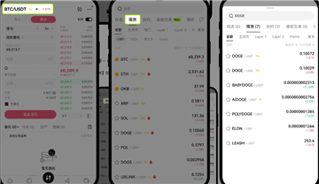 以狗狗币DOGE为例:打开APP,进入【交易】页面 — 点击左上角币对框【BTC/USDT】;