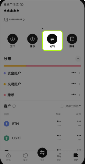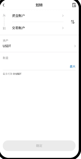 打开oxk交易app,点击【资产】—【资金划转】,选择币种以【USDT】为例 — 从【资金账户】— 到【交易账户】— 输入划转【数量】—【确定】。