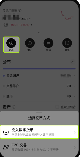 1、打开App 首页,点击【资产】—【充币】—【充入数字货币】,例如选择币种【USDT】。