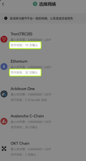 不同币种对到账所需的确认数要求不同。以 USDT 为例, TRON 网络需要 19 次确认才能完成,而 Ethereum 网络则需要 32 次确认(具体信息请以页面显示为准)