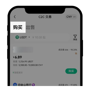 C2C 买币:1)打开 App 首页,点击【买币】- 【C2C 买币】。在购买页面,点击【USDT】可以搜索数字资产,点击【筛选】可以选择委托单类型和支付方式。设置完成后,选出符合条件的商家,点击【购买】。