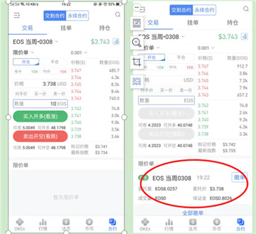 开仓举例:EOS当周交易--限价单--买入开多10个EOS(10个EOS实际上只抵押了1个EOS。因为10倍杠杆。)