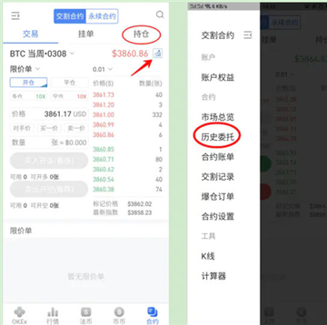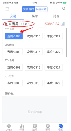 3.选择合约类型:选交割合约----点击红色圈内---当周合约。(短线操作建议当周合约,长期操作建议季度合约,季度合约交割时间充裕,可以短期也可以长期持有)选择币种:建议主流币种,小币种其交易深度不足。