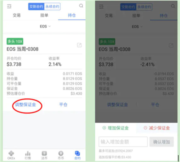 此时成交了:当前的持仓状况,10倍杠杆,看多,扣掉手续费,剩余持仓量,目前收益率2.14%,开仓均价3.738. 成交后,保证金是可以调整,如果行情开始下跌,快爆仓了,但是你依然坚信会涨,就可以补保证金,补了保证金后,强平价格就会相应的变化。