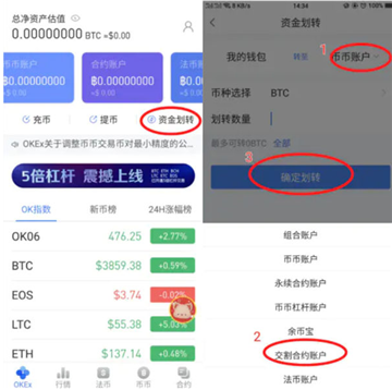 1.资金划转:(资金划转:如图OKEX目前有好几个账户包括我的钱包、币币账户、合约账户、法币账户,如果新人买币后发现币币账户还是空的,是因为你买的币还在法币账户中,需要划转到币币账户才能进行交易。如果进行合约交易,则需要划账至合约账户中)如图点击1.---2.交割合约账户--划转数量---3.确认划转。