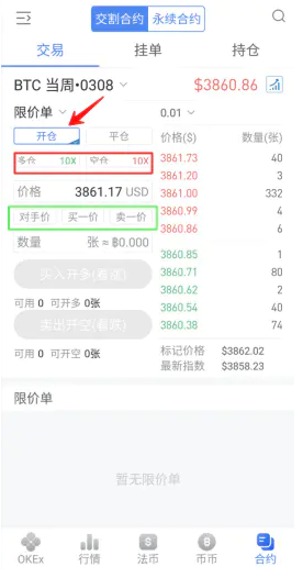 在交易界面点击开仓---看涨选择“买入开多”,看跌则选择“卖出开空”---根据情况选择杠杆倍数(红框内是杠杆倍数)----输入价格或选择绿框内开单计价方式下单---输入数量---然后点击“买入开多”或“卖出开空”。