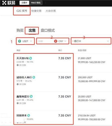 11、在【C2C交易】页面点击【出售】,币种选择【USDT】法币选择【CNY】,交易方式选择【银行卡】就是用银行卡进行交易,也可选择其它方式,选择合适的商家,点击【出售USDT】 即可