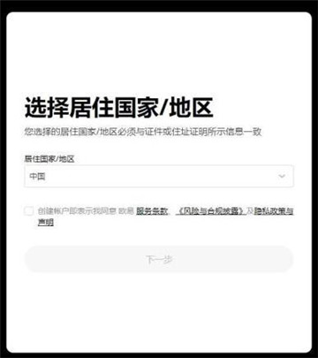 3、选择居住国家/地区,勾选服务条款、《风险与合规披露》及隐私政策与声明