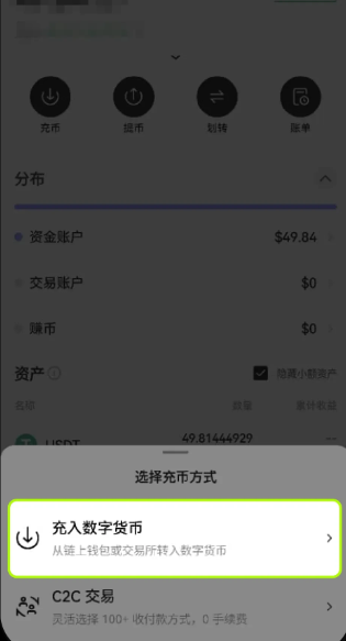 1、打开App 首页,点击【资产】—【充币】—【充入数字货币】,例如选择币种【USDT】。