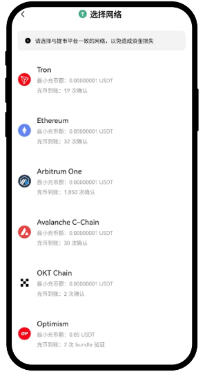 注意:选择充币网络时,其他交易所或钱包【提币/提现网络】要与欧易充币的网络保持一致,例如都为 USDT-TRON (TRC20),否则币会丢失。