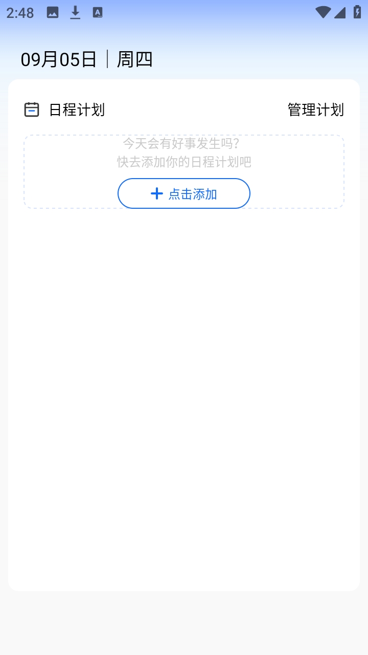 2、自动跳转至日程计划管理页面,点击页面醒目位置的+点击添加快捷按钮。