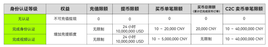 以下是不同身份认证等级充提币限额: