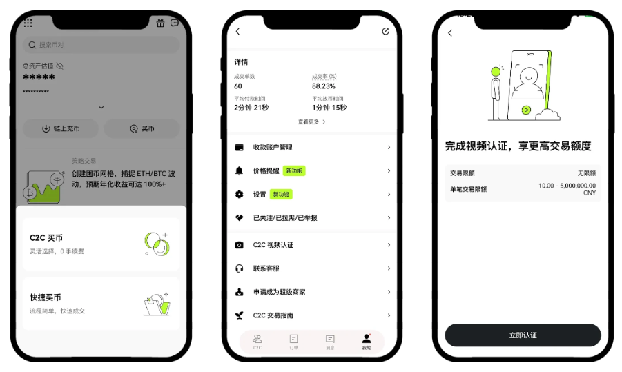 2)视频认证需要在【C2C买币】中进行,打开欧意 App 首页,点击【买币】-【C2C买币】-【我的】-【视频认证】-【开始录制】。视频认证时,请确保开启声音,打开摄像头,不要连接耳机。系统会朗读风险提示,您不需要跟读。确认信息无误后,请您在“嘀”声后回答【是的】,然后提交资料,等待审核。