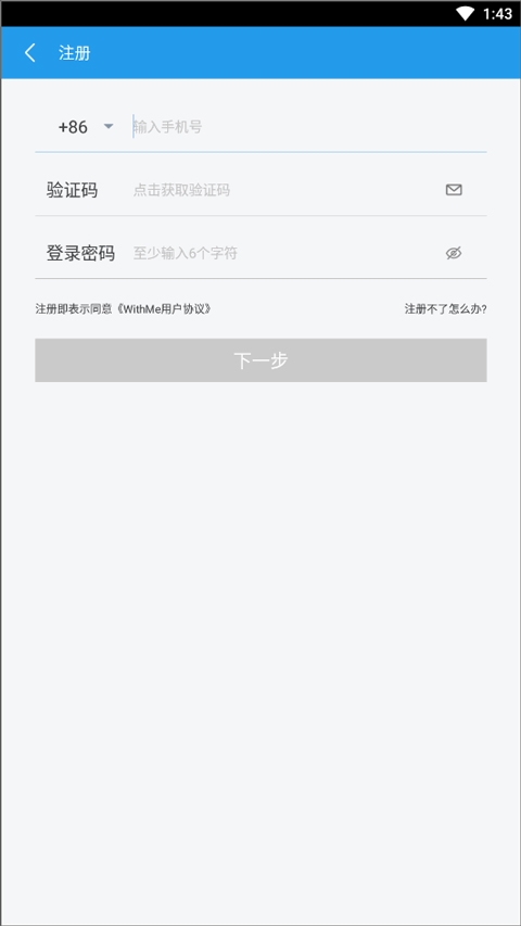 3、输入手机号、密码后,获取验证码并填写,点击下一步即可完成注册;