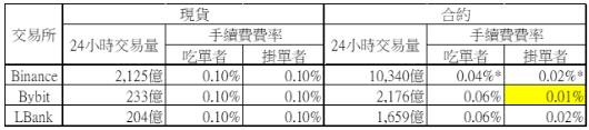 Binance、Bybit、LBank交易所手续费比较图;