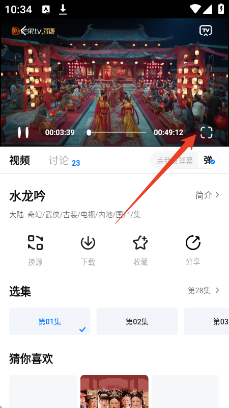 1、打开软件,选择一部影视,点击进入,然后点击【全屏播放】图标