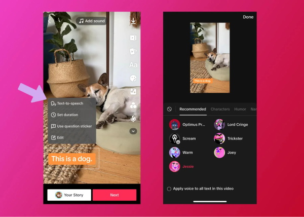 ● 文本转语音。TikTok的文本转语音功能是一个热门选项,可为你的TikTok视频添加语音内容,而无需使用自己的声音。