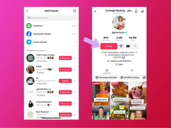将TikTok与其他应用连接,或允许其访问你的联系人,它就会推荐你的朋友以便你关注他们。你还可以关注你所在行业的其他品牌,以获取灵感或建立自己的关系网络。