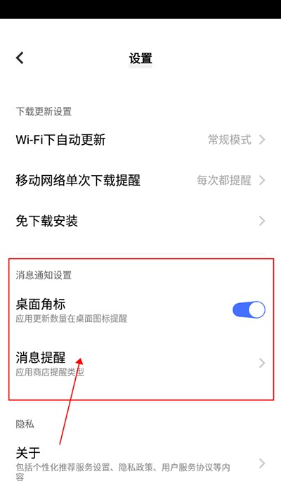 2、进入消息提醒这个关闭即可,关闭后再有应用可以更新时将不会在桌面上显示提醒了。