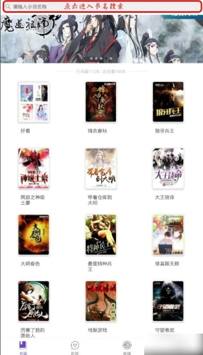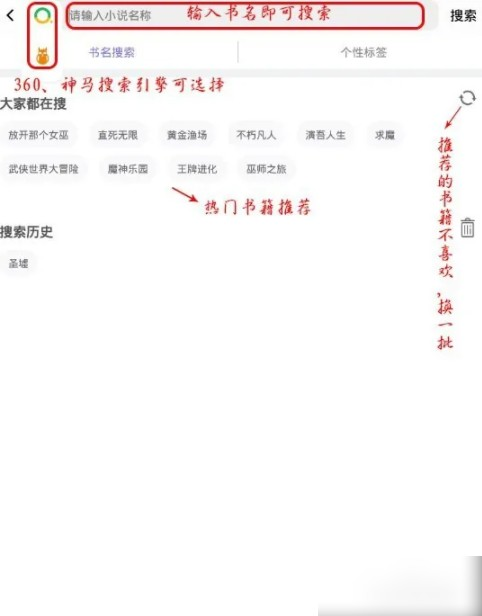 2、使用搜索功能查找书籍,可输入书名或标签快速定位喜欢的小说。