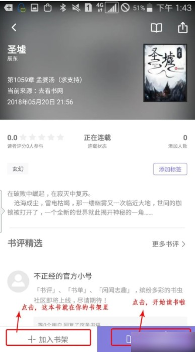 3、点击进入书籍详情页,点击“进入阅读”开始阅读;喜欢的书点击“加入书架”方便下次阅读。
