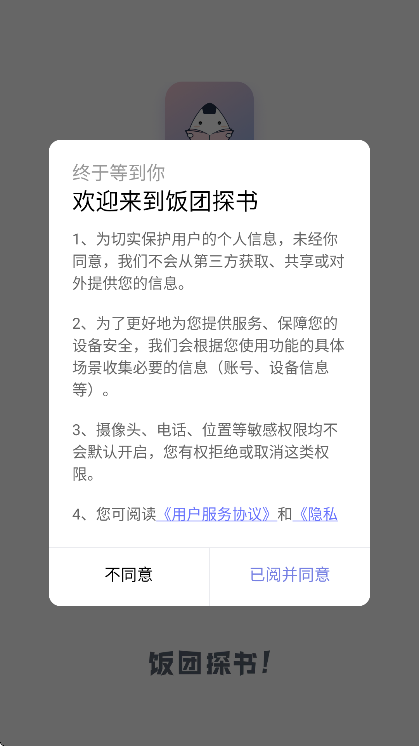 1、下载并安装饭团探书APP,首次进入软件须同意隐私权限。
