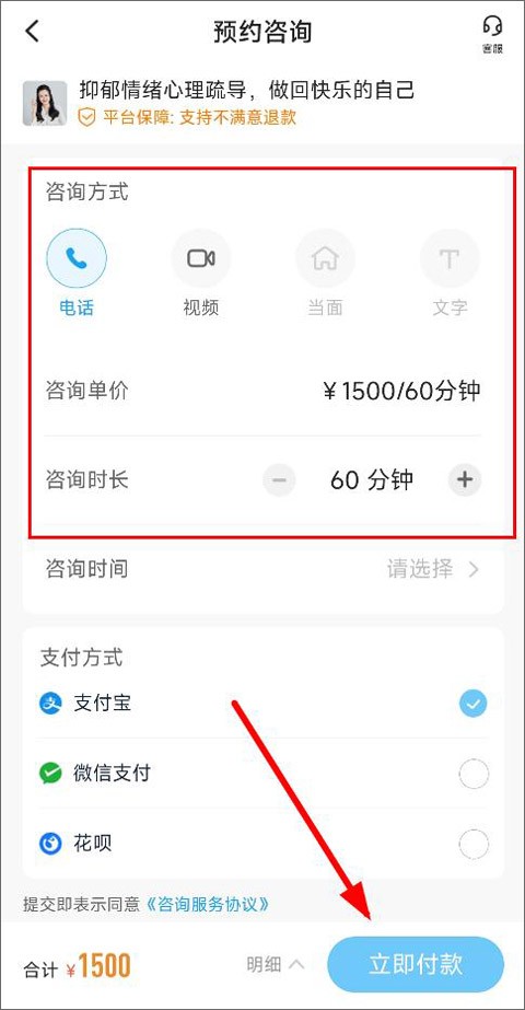 4、用户根据自身情况,选择预约咨询服务主题,选择咨询方式(电话、视频)、单价、时间,付款即可预约成功。