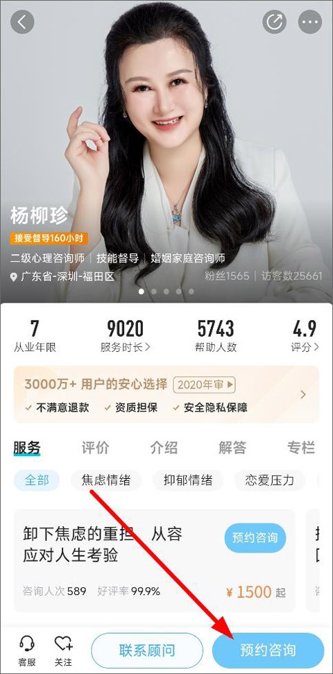 3、打开咨询师页面,可以查看咨询师基本信息,包括姓名、地址、从业年限、擅长技能、服务人数等,用户可联系顾问或预约咨询;