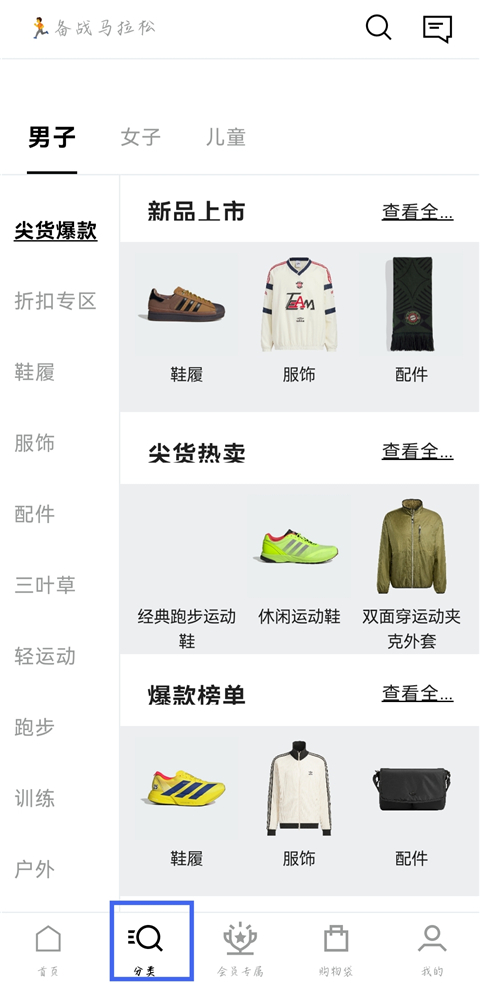 1、打开阿迪达斯官方APP,在【分类】中浏览查看商品类别。