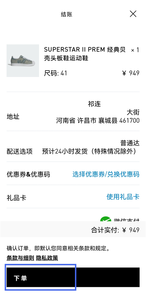 5、确认地址和支付方式,点击【下单】即可。