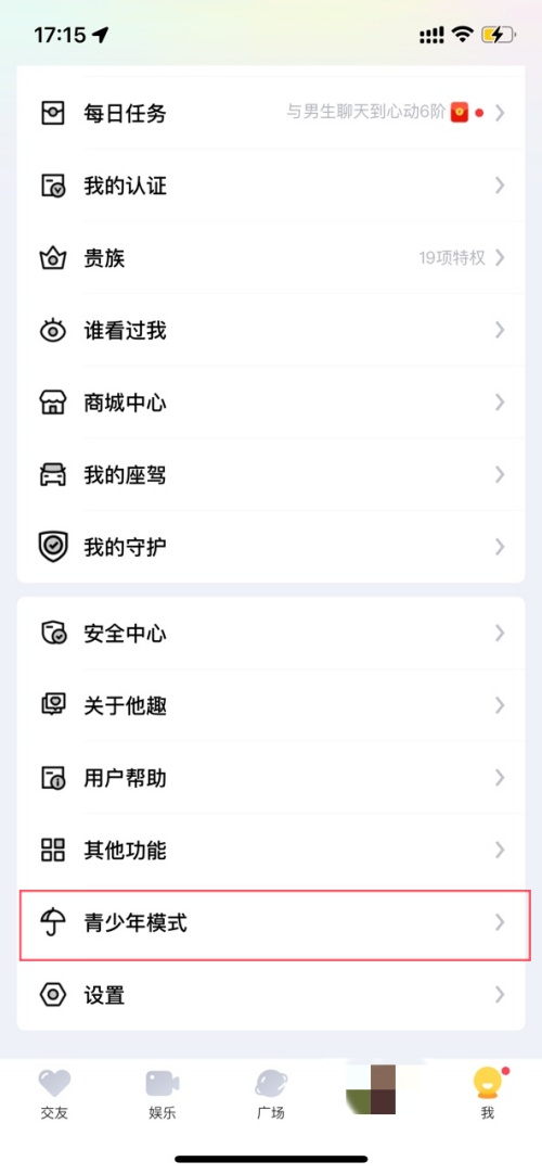 2、进入我的页面后,在下方找到青少年模式选项并点击;