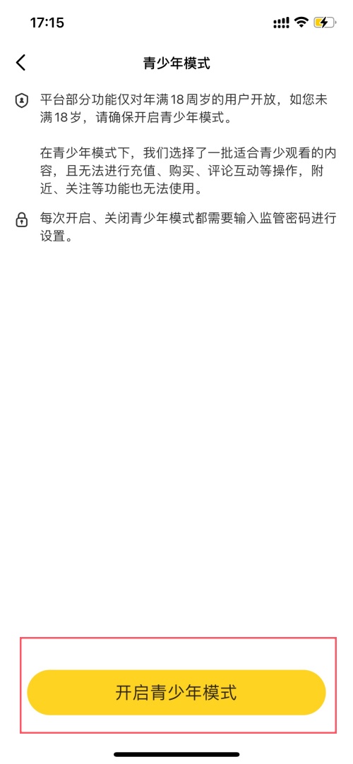 3、在青少年模式页面,点击底部的开启青少年模式;