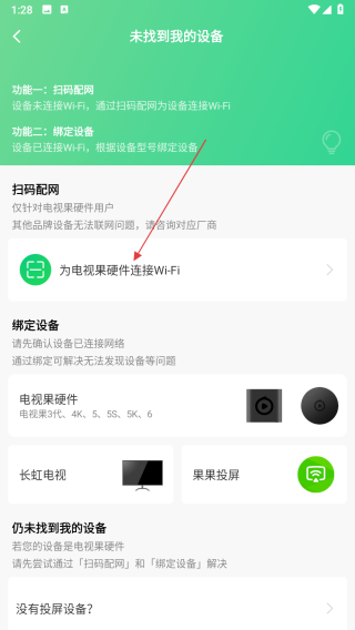 3、在未找到设备页面,点击为电视果硬件连接Wi-Fi选项,进入为电视果连Wi-Fi的指引页面。