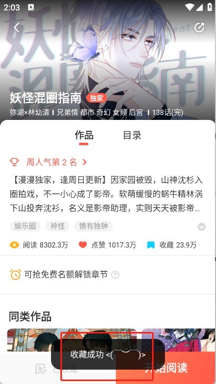 1、进入兜兜动漫的软件首页页面,找到喜欢的漫画点击进入详情页,点击“收藏漫画”。