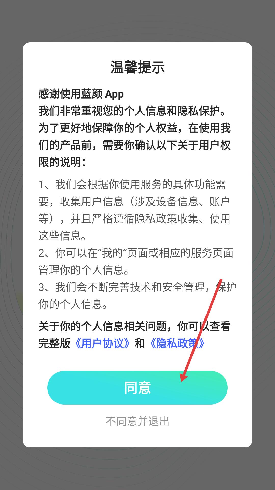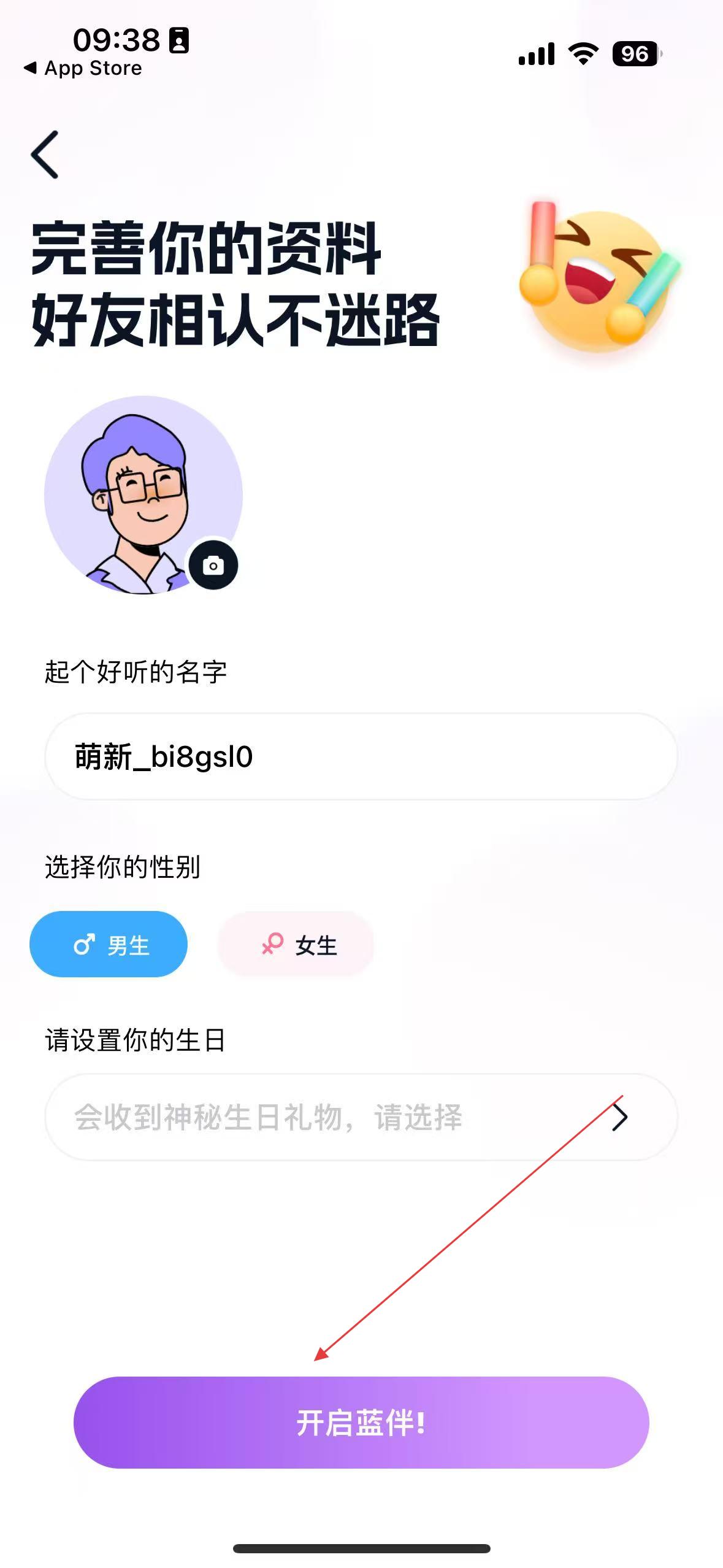 1、打开蓝颜App,点同意提示,进入资料页,完善昵称、性别、生日,点开启蓝伴,开启社交。