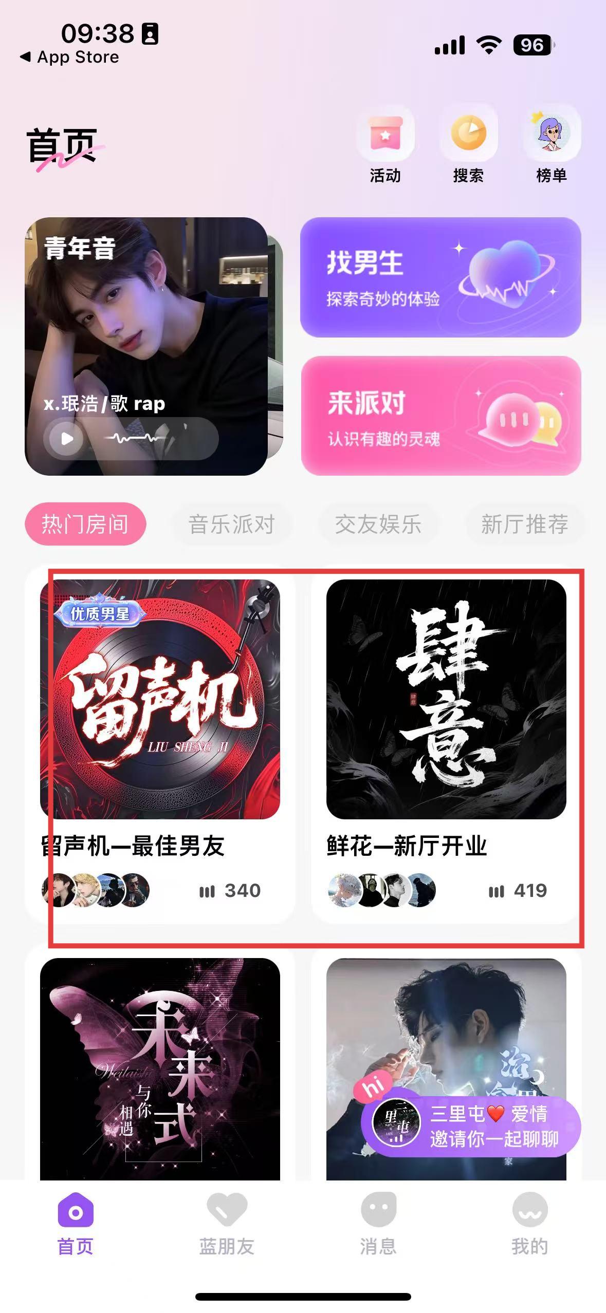 3、进入首页,点热门房间,进留声机、肆意等厅,互动交流,参与音乐派对、交友娱乐,拓展社交。