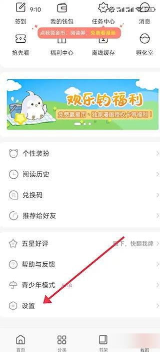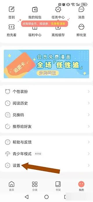 1、点开飒漫画APP里的“我的”版块,点击页面的设置选项。