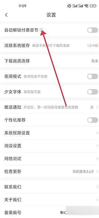 3、浏览设置菜单时,找到自动解锁付费章节选项,点击右侧的开关将其关闭。