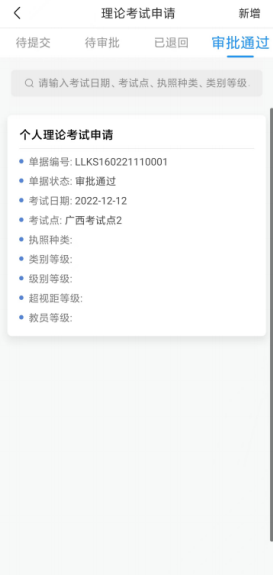 1.个人用户登录 APP,点击“办事”页签后,点击“理论考试申请”功能后,首先进入理论申请录入列表页面。列表分为四个页签,分别为:“待提交”“待审批”“已退回”“审批通过”,如下图所示: