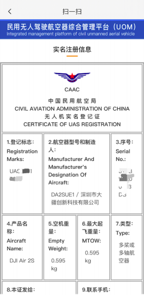 1.扫一扫功能能够扫描无人机持有人的二维码,查看该无人机的详细信息,点击后如下图所示: